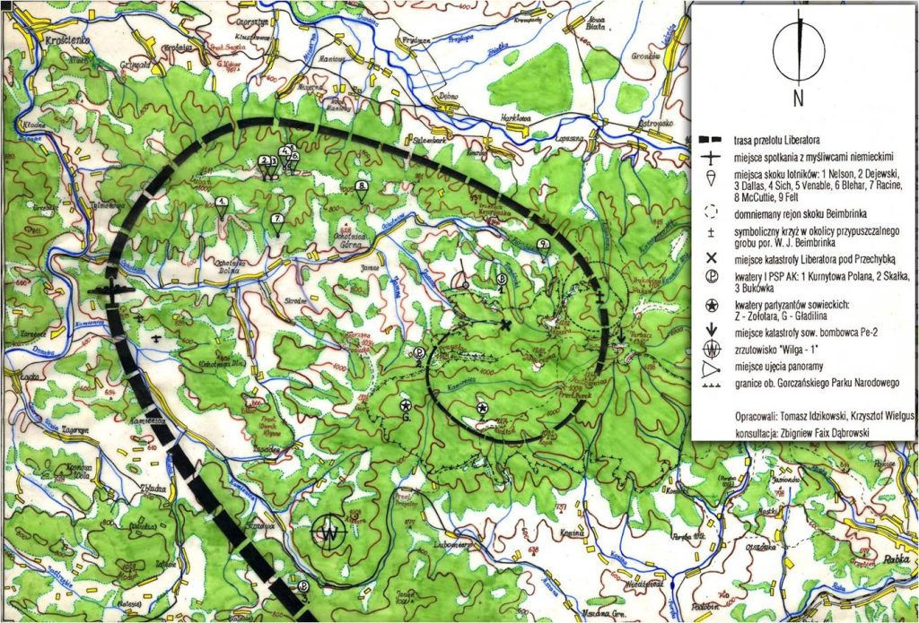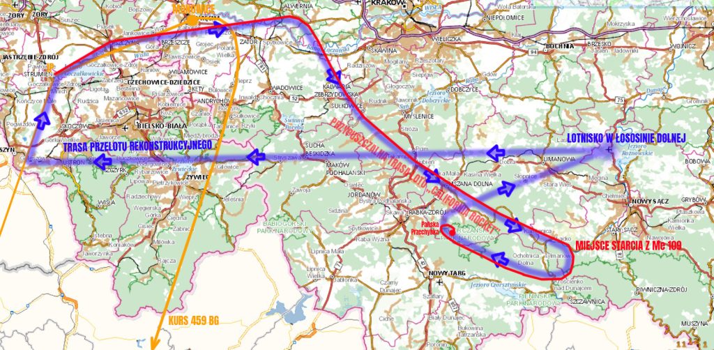 Łososina Dolna – rejony Goleszowa( wejście na kurs całej eskadry bombowej 459 BG- (INITIAL POINT) nad ujściem Wisły do jeziora goczałkowickiego w rejonie miejscowości Strumień Strumień – Pszczyna (ul. Katowicka) miejsce zrzucenia zabezpieczonych bomb – kurs wschodni w kierunku Krakowa- kurs południowy pomiędzy Alwernia i Spytkowicami – Kalwaria Zebrzydowska- Sułkowice- Mszana Dolna- dolina Kamienicy- Szczawa- Łącko (miejsce ataku 3 Messerschmittów Bf 109) _ Pasmo Lubania – Runek – Przełęcz Knurowska – Dolina Łopusznej – Wyżni Zarębek –  Przełęcz Długa – Kudłoń -Jaworzyna Kamieniecka –   Pańska Przehubka- Powrót do lotniska w Łososinie Dolnej .